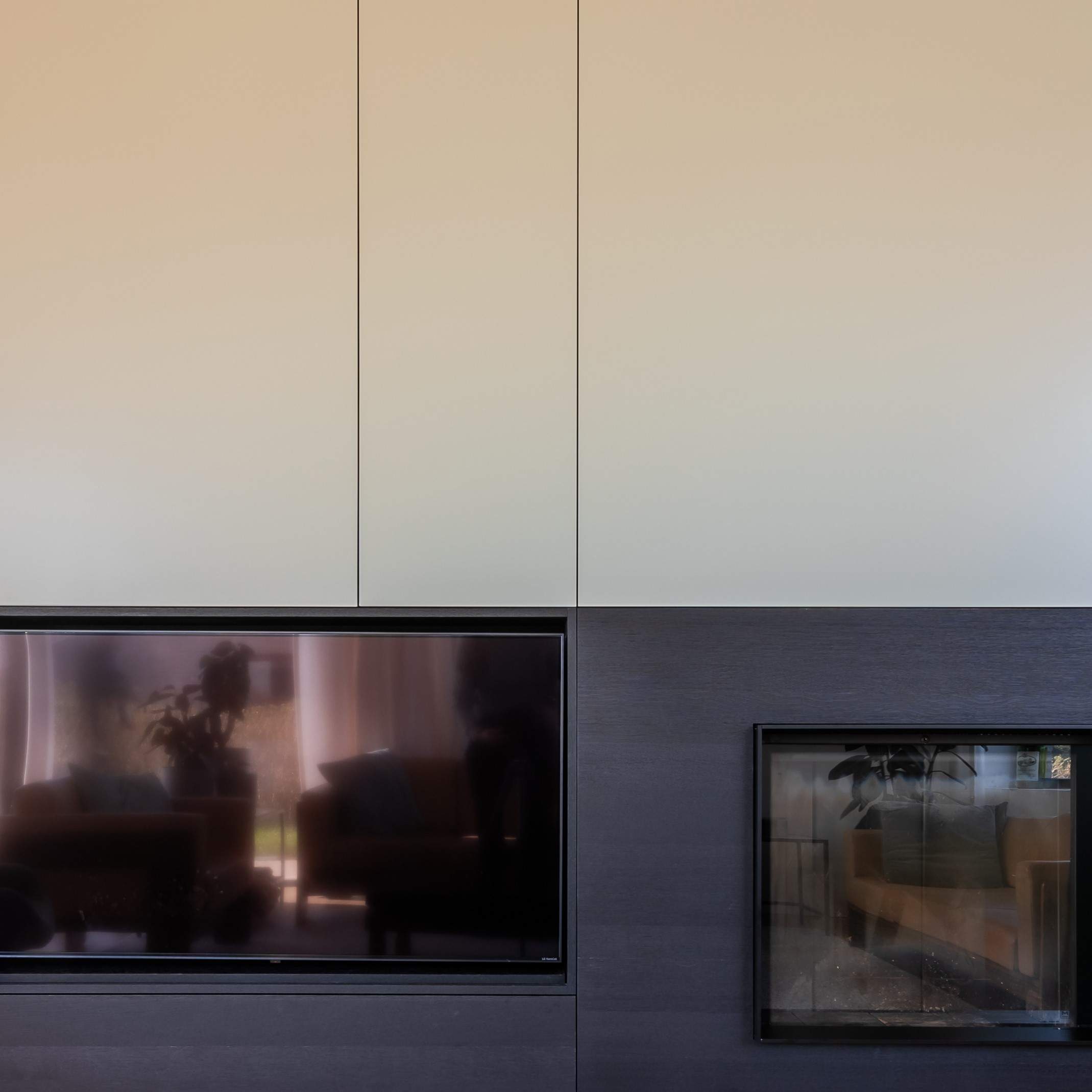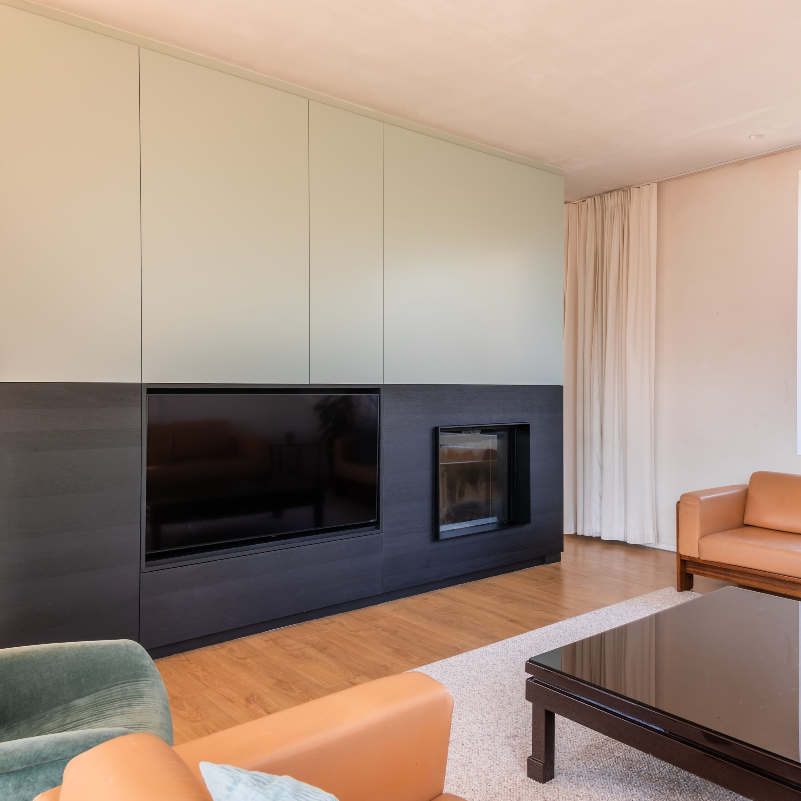 Dit haarmeubel combineert diep geborsteld zwart eikenfineer aan de onderzijde met vier pastelgroen gelakte panelen erboven, wat zorgt voor een elegant contrast. De structuur van het hout voegt diepte en karakter toe, terwijl de zachte pasteltint een frisse en verfijnde toets geeft. Het samenspel van materialen en kleuren creëert een tijdloze en harmonieuze uitstraling.