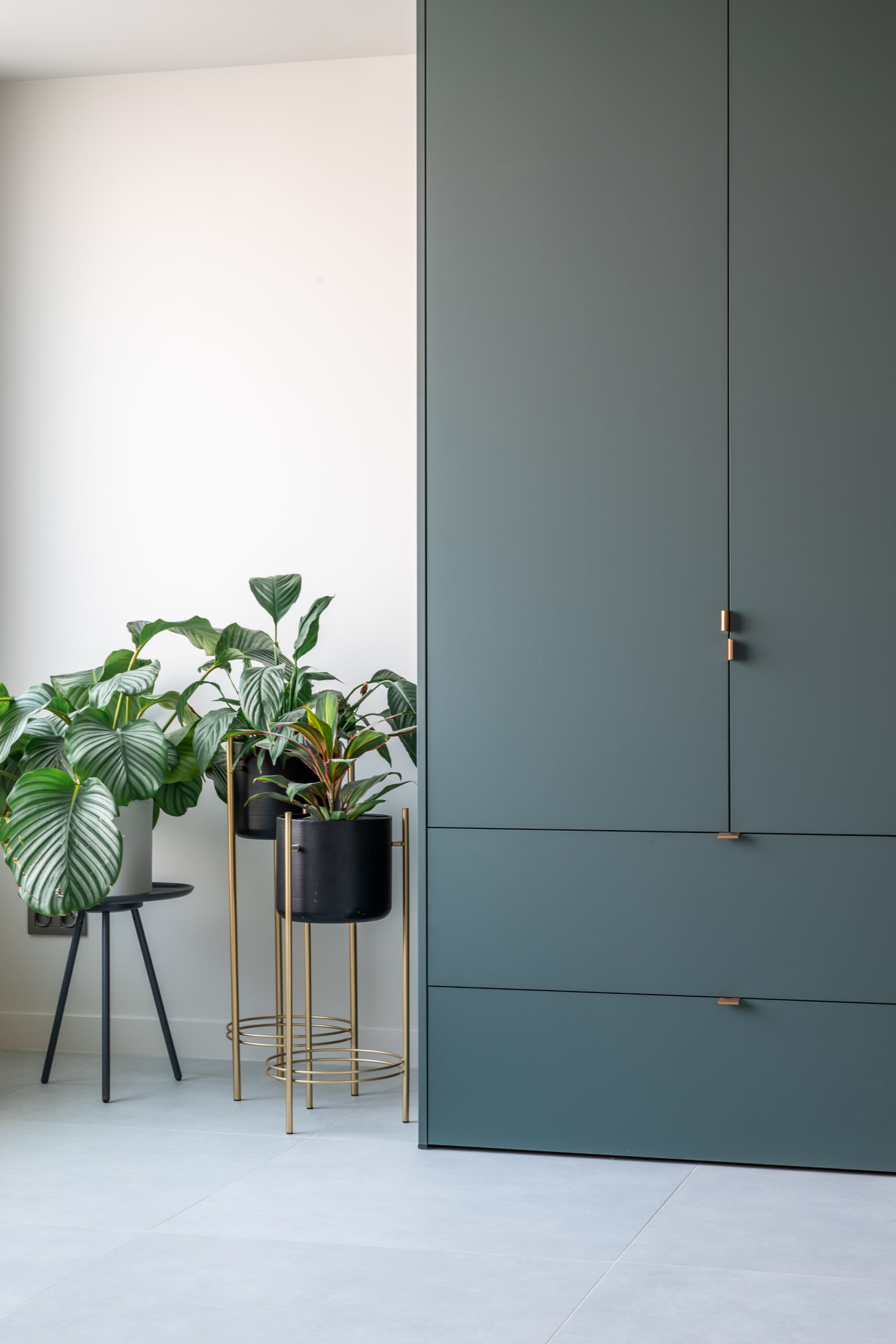 Deze inkom werd met een groene matte laminaat omgevormd tot een plek waar je rustig thuiskomt. De diepe kleur en de lichte accenten in messing zorgen voor een echte eye-catcher bij het binnenkomen in de woning.