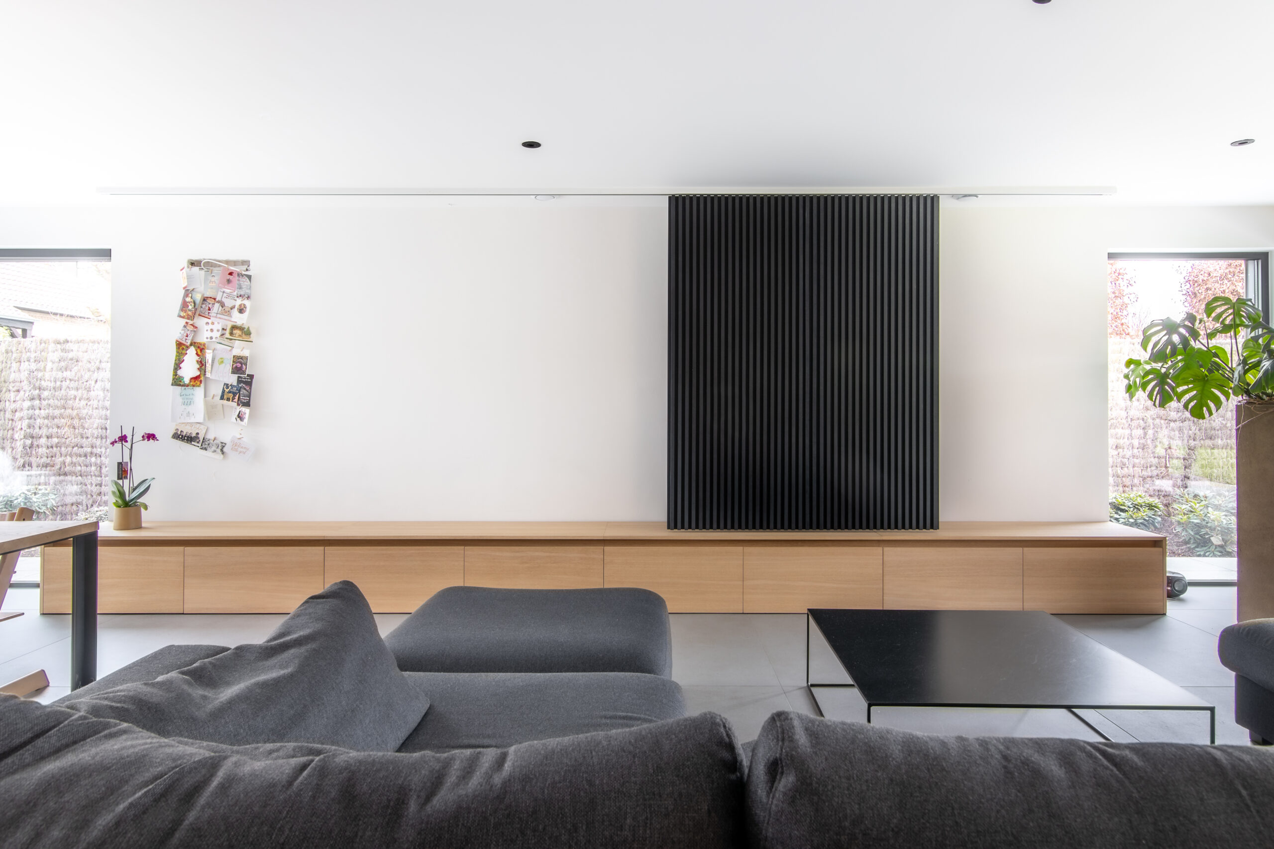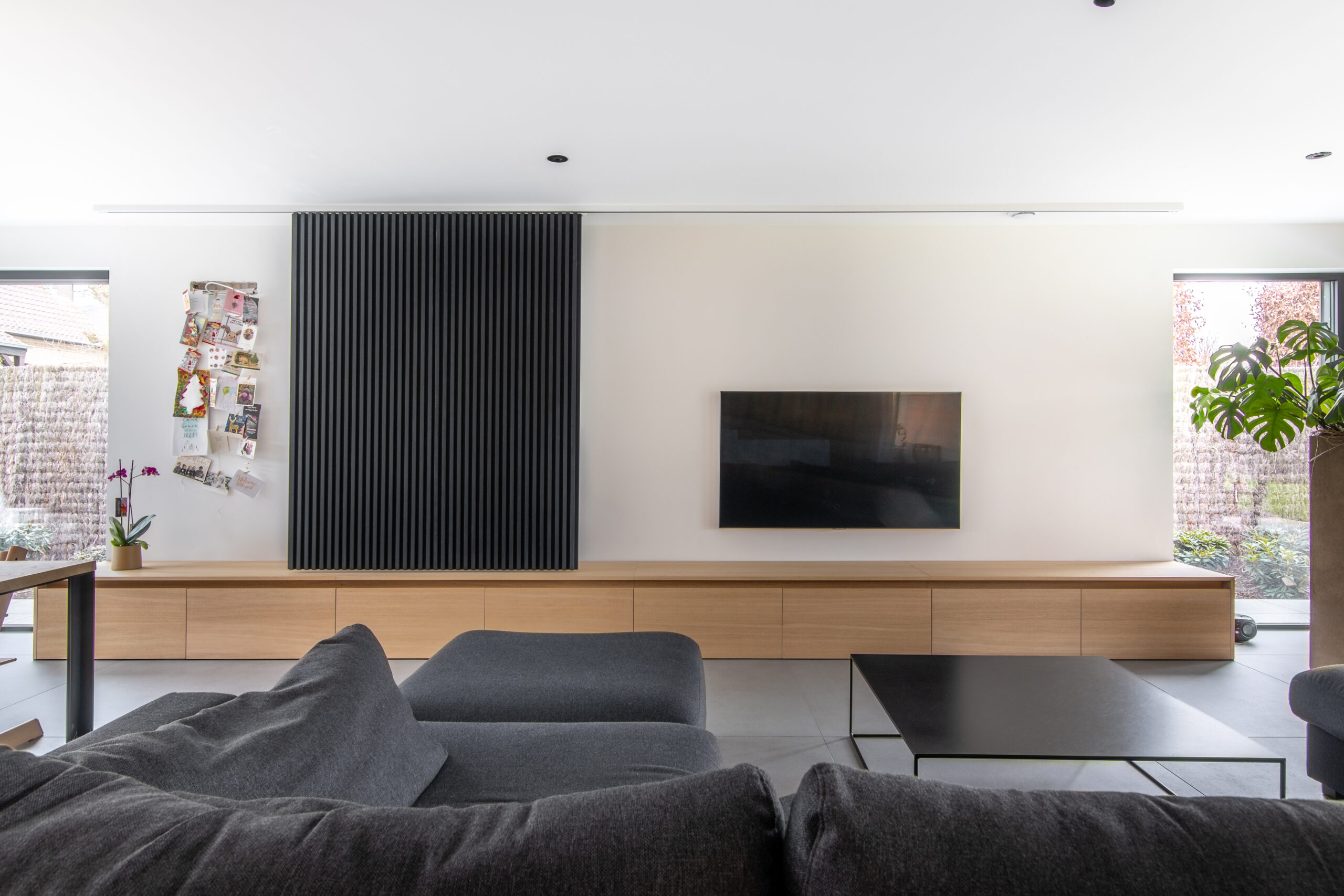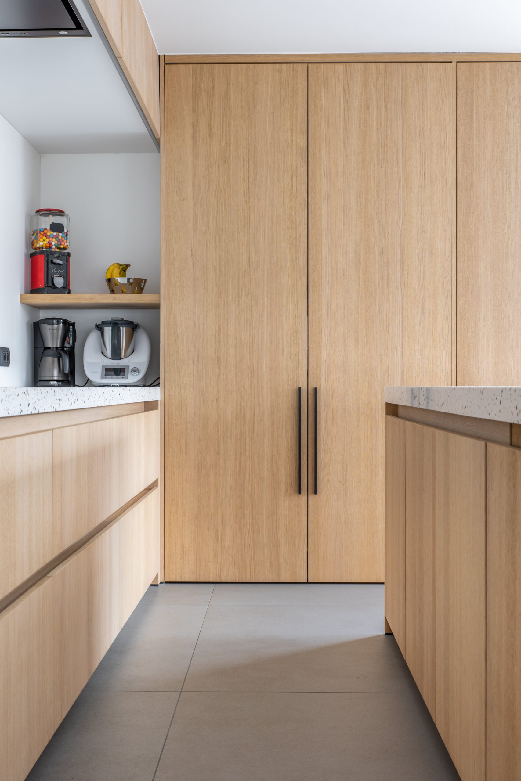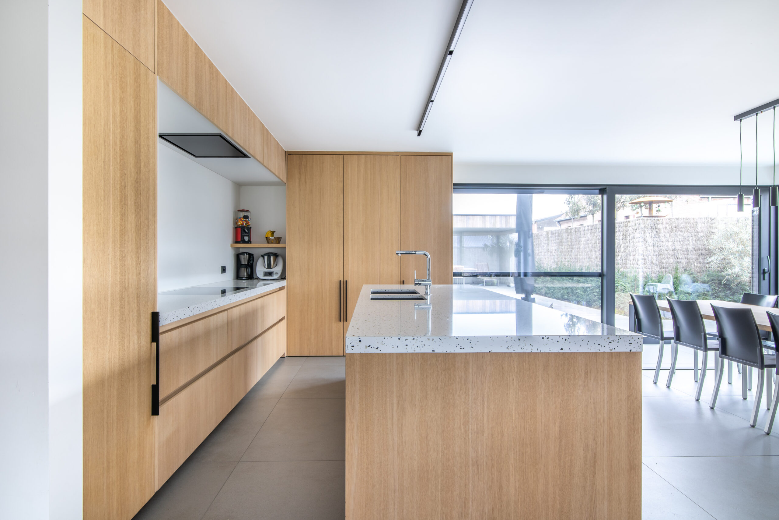 Deze nieuwbouw in Tielt is ontworpen met een focus op zowel stijl als functionaliteit. Het interieur is afgewerkt met diep geborsteld kwartiers eikenfineer, wat de ruimte een warme en tijdloze uitstraling geeft. Het aanrecht en bureau zijn vervaardigd uit terrazzo composiet, waardoor een moderne en verfijnde sfeer ontstaat. De bureau is voorzien van praktische, ingebouwde kastruimte die zowel het esthetische als het functionele aspect van de ruimte versterkt, en zorgt voor een georganiseerde en opgeruimde werkplek.