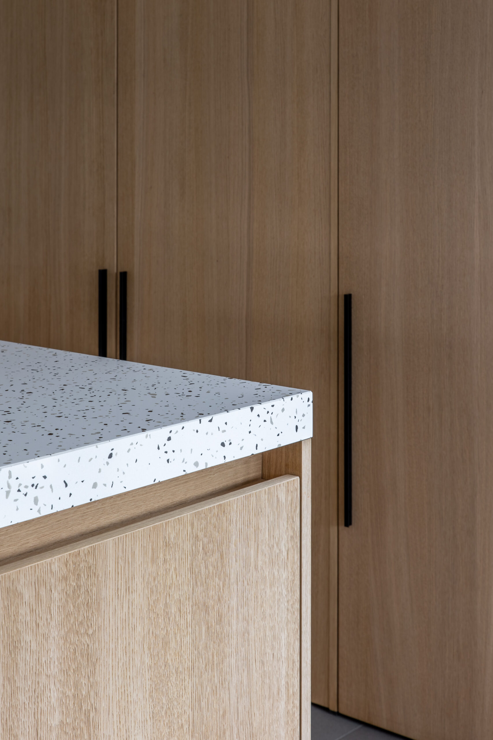 Het interieur van deze nieuwbouw in Tielt combineert diep geborsteld kwartiers eikenfineer met terrazzo composiet, voor een moderne en functionele ruimte