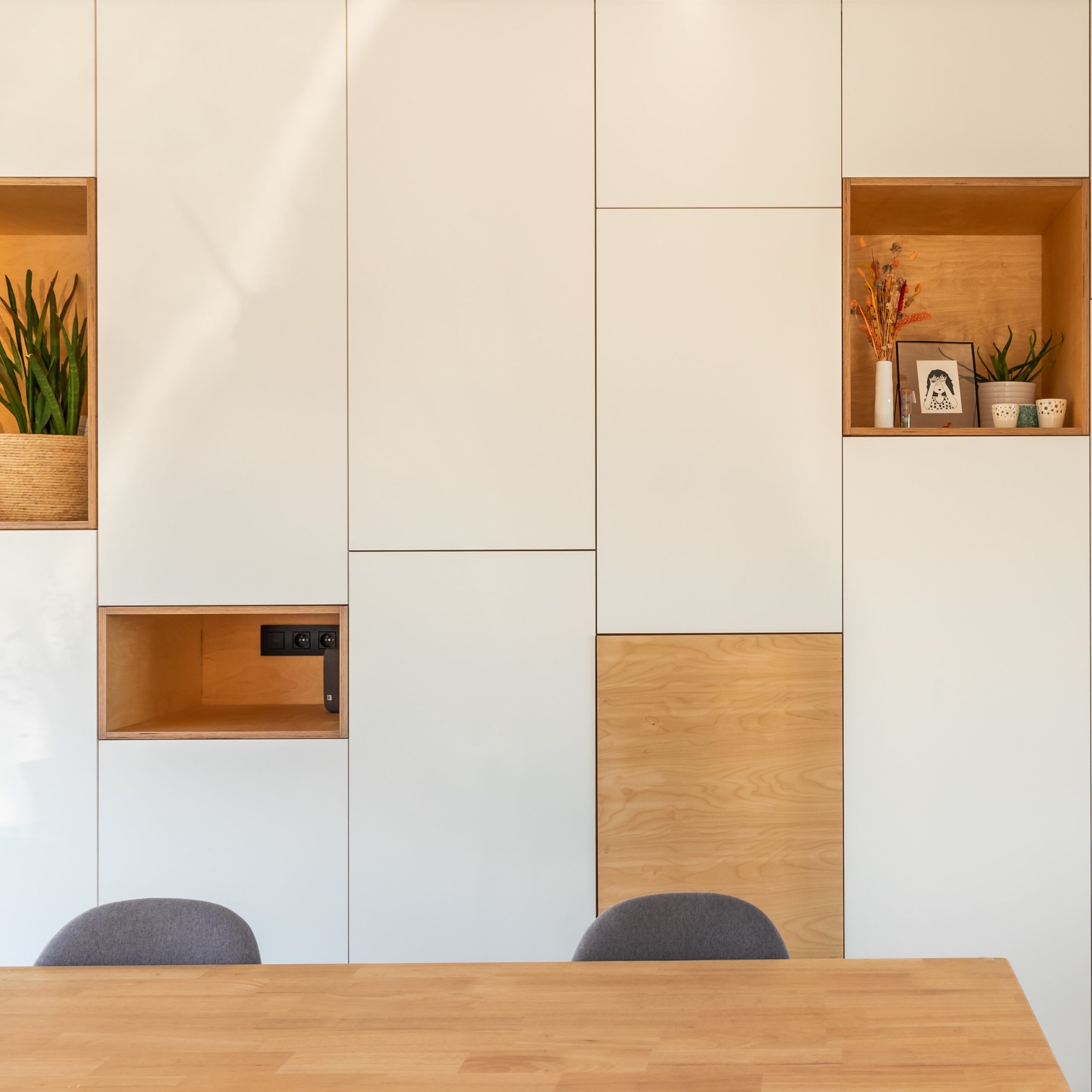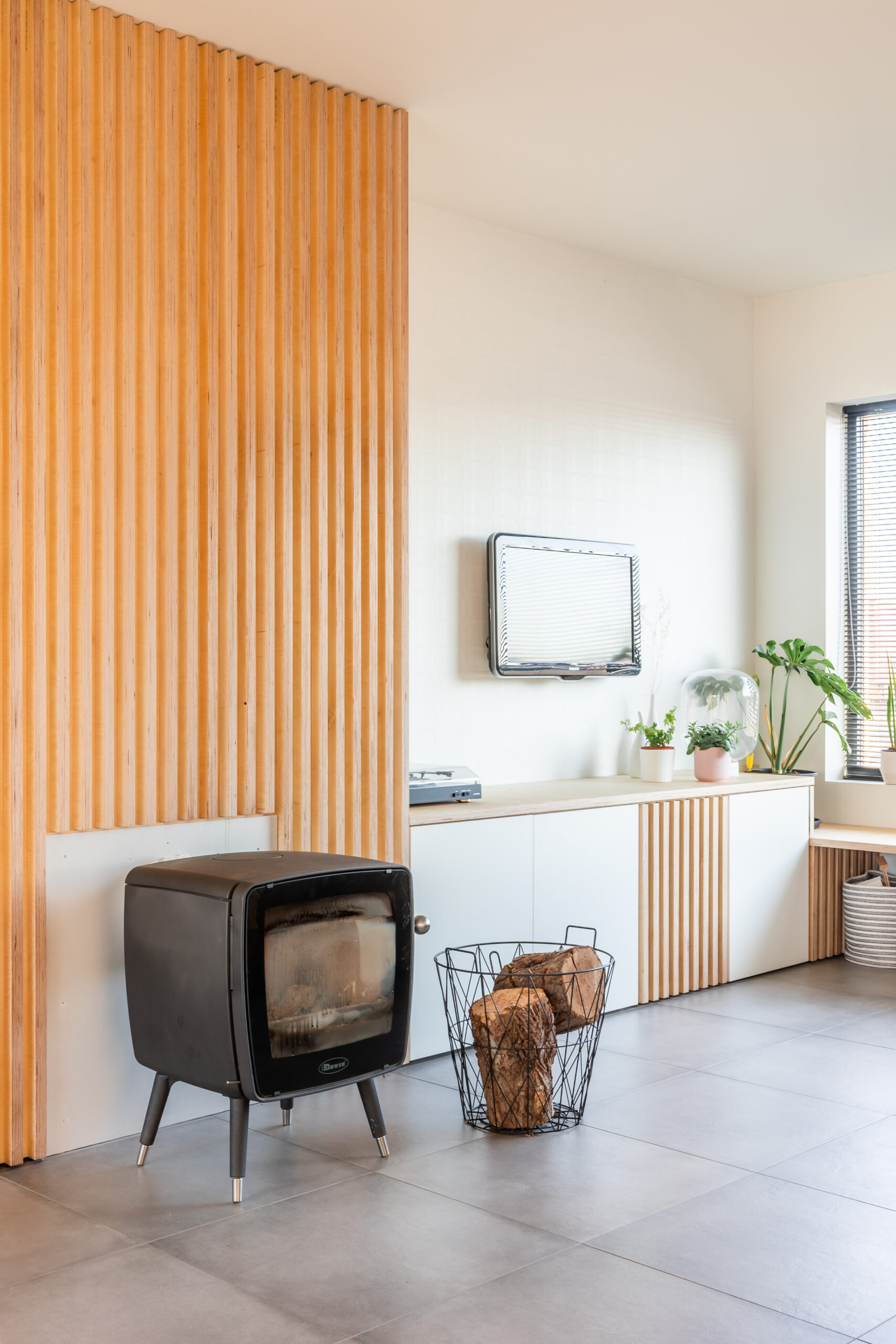 Dit wandmeubel in multiplex berk en witte laminaat kreeg een speelse look door een combinatie van functionele opbergkasten en nissen in berk. Bij de haard en zithoek verlaagt het meubel tot een zitbank.
